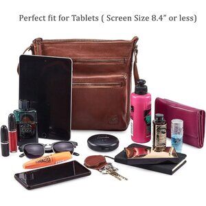 ✔9.5” Height x 9.0" Length x 1.5” Width. 1 Front gusseted zippered pocket, 1 Drop lining zippered pocket in front and 1 main zipper pocket (back zip pocket inside the main zipper pocket to keep valuables well secured). Easy to take iPad (7.9" Size) , lipsticks, sun cream, cellphone, car keys, small makeups, checkbook wallet case, charger, etc. Strong shoulder strap(2-layer desigly adjustable.n, both is leather), strap lengths about 51 inches, ful
