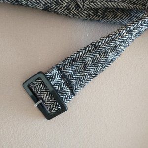 Esprit Size 4 wool blend double breasted jacket with belt. Black and white tweed pattern. Previously worn, great condition as shown in pics, no stains or marks. Wool blend is 75% wool as shown in fabric composition tag. Measurements: Neck opening to hem length = 23.5", top of shoulder to hem length = 28.25", armpit to sleeve length = 18.75". Flat measurements across hem = 17.75", across waist = 14", across chest underneath armpits = 16".