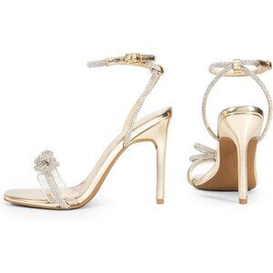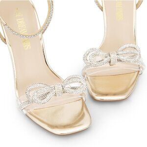 🆕 Women Gold Double Bowknots Crystal Sandals Clear Slingback Square Toe Heels