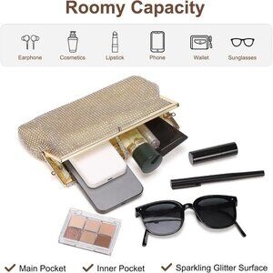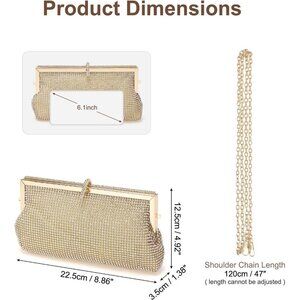 [Capable]: The Clutch Purse Size(LxWxH) is 22.5 x 3.5 x 12.5 cm / 8.86 x 1.38 x 4.92 inches, lightweight at only 0.5 pound. The Clutch purse material is PU fabric and crystal rhinestone, Its color is Gold, Shoulder strap length is 120 cm / 47 inch. The evening bag is enough to hold the most needed items, such as makeup brushes, mobile phones, cards, money, car keys, and small wallets, ensuring you are prepared for any occasion.