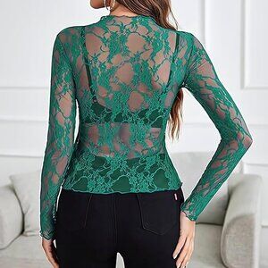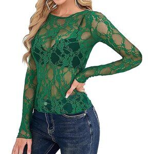 🆕Women Green Polyester Lace Long Sleeve Mesh Sheer Sexy See-Through Y2K Top