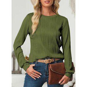 🆕 Women Green Trendy Casual Long Sleeve Crewneck Tops Loose Textured Blouses
