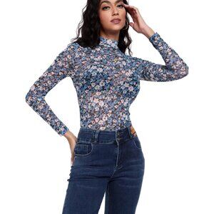 Women Light Blue Floral Long Sleeve Mock Neck Fitted Sexy See Through Mesh Tops