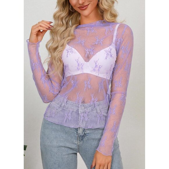 🆕Women Light Purple Polyamide Mesh Sheer Long Sleeve Mock Neck Lace Top Blouse