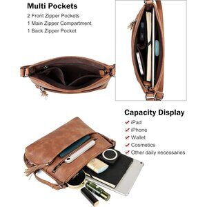 👍 Reasonable Capacity: If you needed something a little bigger than what you are used to carrying, but didn't want anything too big, just need purses to carry the bare minimum (I.D., phone, charger, lipstick & credit card) and this cross body bag does a great job. You will love the different zippered compartments making it easy to find your daily necessaries.