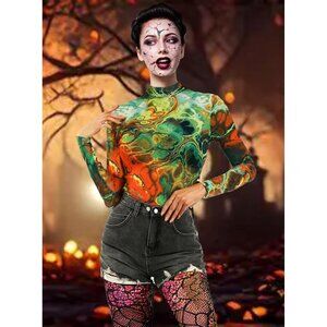 Women Orange Long Sleeve Mock Neck Fitted Sexy See Through Mesh Going Out Tops