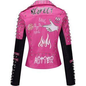 π Women Pink Faux Leather Jacket Studded Rivet Spring Fall Winter Fashion Belt