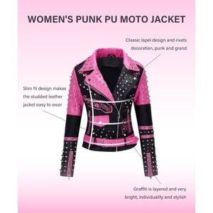 Feature: The women's faux leather jacket is designed with PU fabric printed graffiti, studded rivet, two side zip pockets, long sleeves, belted. This women's motorcycle jacket also features a beautiful chic lapel style and asymmetric zip and quilted shoulders. You can wear our moto coat in spring, fall and winter.
