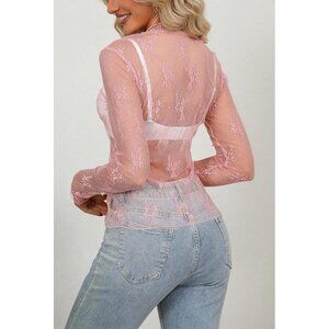 🆕Women' Pink Mesh Sheer Top Long Sleeve Mock Neck Lace Floral Blouse Polyamide