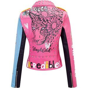 Novelty: Perfect combination of studded rivet and color printing, the trendy clothes for women show a sense of fashion. With classic style, unique design, full of charming temperament, this Moto jacket can show your personality well.