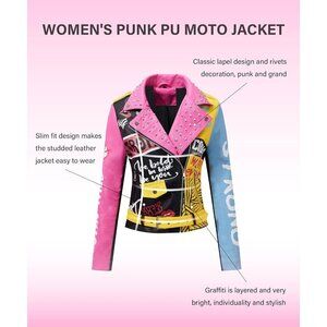 Feature: The women's faux leather jacket is designed with PU fabric printed graffiti, studded rivet, two side zip pockets, long sleeves, belted. This women's motorcycle jacket also features a beautiful chic lapel style and asymmetric zip and quilted shoulders. You can wear our Moto coat in spring, fall and winter.