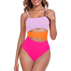 🆕Women Purple Orange Hot Pink Polyamide Geometric Cutout Bandeau One Piece Swim
