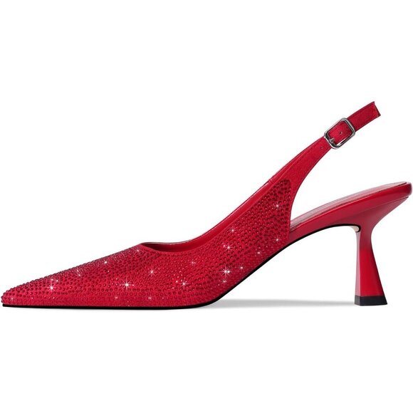 🆕 Women Red Faux Leather Kitten Heels Slingback Rhinestone Dress Pumps