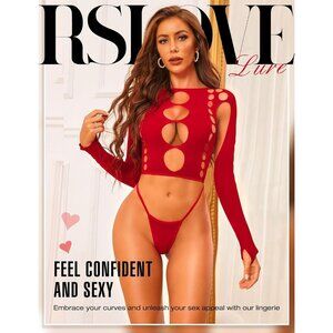 🆕Women Red Fishnet Lingerie Set Bodysuit Hollow Out Long Sleeves Sexy Baby Doll