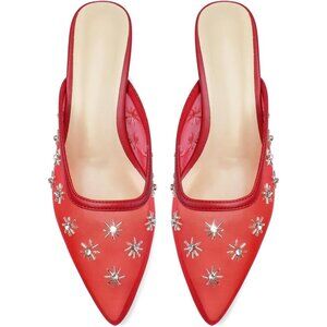 🆕Women Red Mesh Kitten Heel Mules Crystal Flower Pointed Toe Low Heel Pumps