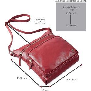 ✔11”Height x 11" Length x 1.75” Width. 1 Front gusseted zippered pocket, 1 Drop lining zippered pocket in front and 1 main zipper pocket (back zip pocket inside the main zipper pocket to keep valuables well secured). Easy to take iPad (9.7" Size) , lipsticks, sun cream, cellphone, car keys, small makeups, checkbook wallet case, charger, etc. Strong shoulder strap(2-layer design, both is leather), strap lengths about 51 inches, fully adjustable.