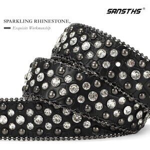 Sparkle in Your Waist --- This diamond belt with western style -Black/White/Brown/Blue/Red 4 colors to choose from-is a great fit for cowboy and cowgirls,and goes perfect with jeans,dress,slacks and any boots.The women western belt will lie in your waist like a shiny winding galaxy,wearing it to a western themed barbecue,horses ,trail ride,sure this bling belt could help you catch all of your friends' eyes in second.