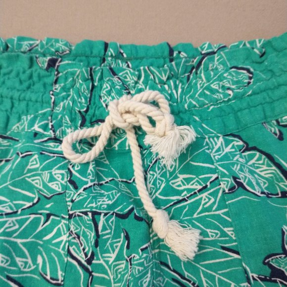 Women's Roxy size XS beach shorts. Shorts are green with white and black tropical leaves pattern perfect for beach getaway! Like new condition, only worn once. Design highlight: string tie. Measurements: Length 9.5" from top of shorts straight down side to hem. Front of shorts length from top to hem is 9". Flat measurement across waist top of shorts is 14.5".
