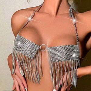 This one-size, adjustable halter-neck set features a shiny metal chain for a custom fit and unique, luxurious style. The flattering tassel hem enhances your curves, making it perfect for nightclubs, parties, or bold fashion moments.