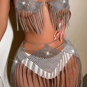 2-piece rhinestone chain halter top & skirt set is crafted from 95% metal & 5% polyester, offering a sexy, soft, and eye-catching look. The sparkly rhinestones and hollow-out chain design create a bold, seductive, and stylish vibe. Easy to care for—suitable for both hand and machine wash.