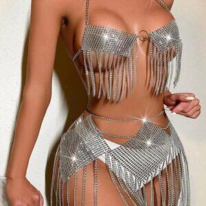 Women Sexy Sparkly Rhinestone Metal Chain Halter Top and Skirt Bodysuit 2 Piece