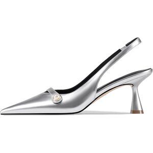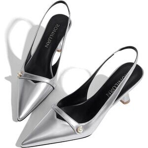 🆕Women Silver Faux Leather Kitten Heels Slingback Pearl Pumps