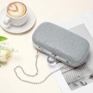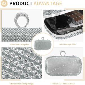 Women Silver Sparkly Rhinestone Evening Clutch Purse Crystal Ring Clasp Handbag