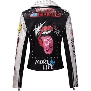 Feature: The women's faux leather jacket is designed with PU fabric printed graffiti, studded rivet, two side zip pockets, long sleeves, belted. This women's motorcycle jacket also features a beautiful chic lapel style and asymmetric zip and quilted shoulders. You can wear our Moto coat in spring, fall and winter.