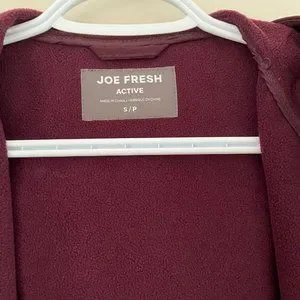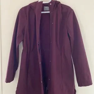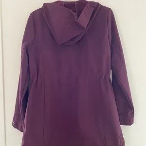 Soft shell jacket with hood, long sleeves, zipper closure, and two pockets.
