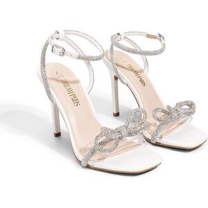 🆕 Women White Double Bowknots Crystal Sandals Clear Slingback Square Toe Heels
