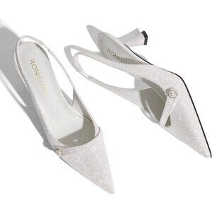 🆕Women White Faux Leather Slingback Kitten Heels Pearl Dress Pumps