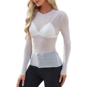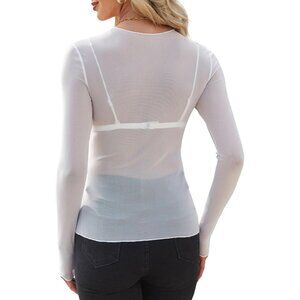 🆕 Women White Mesh Sheer Long Sleeve Tops Lace Sexy Mock Neck Shirts Layering