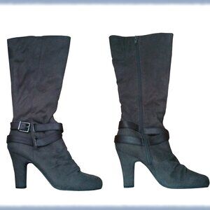 Women's 4" Heel Boots, Olive Green Faux Suede, Brown Buckle, Size 7