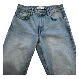 ASOS high waisted, straight leg jeans in a light blue wash. These jeans are made from 100% cotton and have a relaxed fit. They feature a five-pocket design, a zip fly, and a button closure.