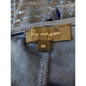 The product is a Women's All Over Sequin Plus 3X Stretch Short Sleeve Tunic in Navy Blue Sparkle. This tunic features a solid pattern with sequin accents, short casual sleeves, and a round neckline. Made from a blend of nylon, metallic, and elastane, it offers a comfortable and stretchy fit for various occasions such as travel, parties, or casual wear. The tunic is machine washable and designed by the brand Lily Morgan, catering to women who love a girly, classic, or fairy style. Perfect for the summer, fall, and spring seasons.