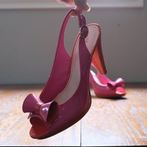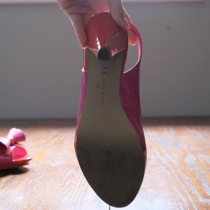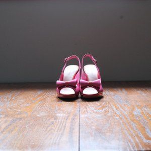 Open toe, sling-back, buckle, pink upper, orange lower.