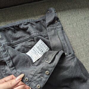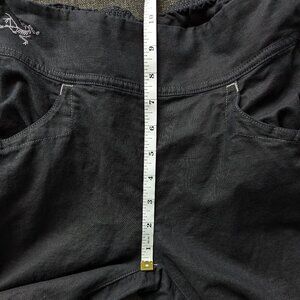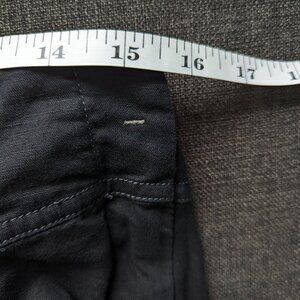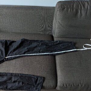 These lightweight black pants from Arcteryx are in very good used condition. No noted rips, holes, stains or areas of excess wear. Slightly cinched at the ankles, with a side zip and snap closure and stylized marks around some of the pockets and seams.