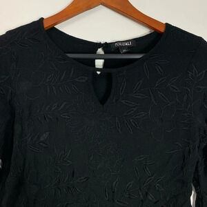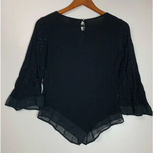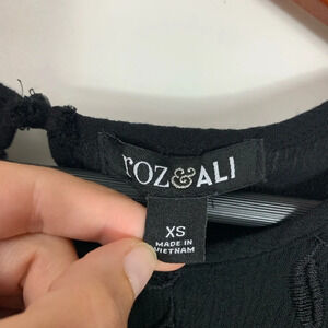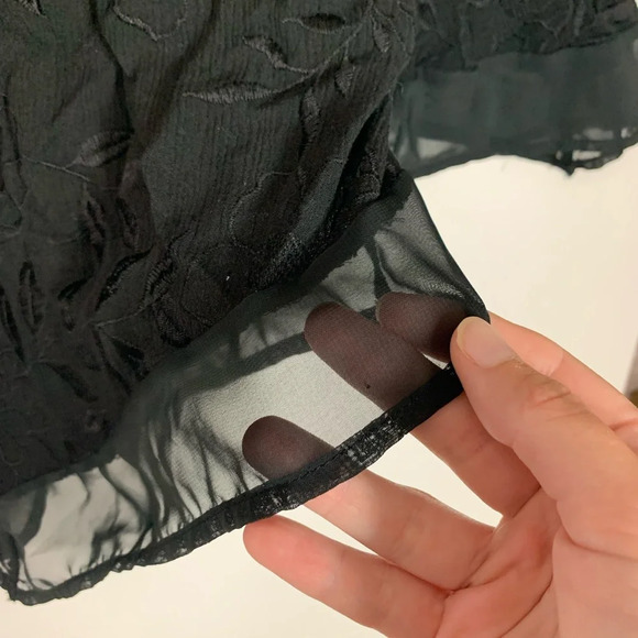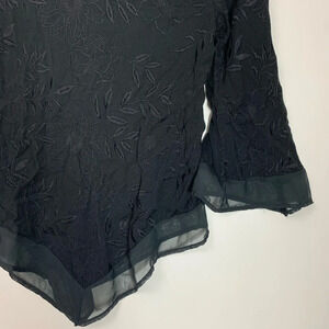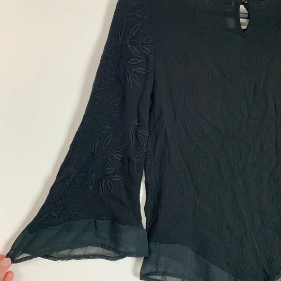 Elevate your wardrobe with this stunning Roz & Ali embroidered blouse in size XS. The unique asymmetrical hem and bell sleeves add a touch of whimsy to your look, perfect for those who embrace the Fairygoth or Dark Romantic style. The keyhole neckline and sheer overlay bring an element of mystery to this black floral top, making it ideal for a casual yet enchanting outfit. Whether you're into Witchycore or Whimsygoth fashion, this blouse is sure to make a statement in any occasion.