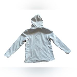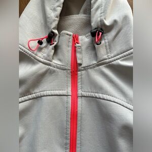 Excellent condition! Off-white (almost a very pale grey) with bright pink zipper and bungee cord-adjustable hood. Two front zipper pockets. The softshell outer fabric has an embossed design on it (see last photo).
