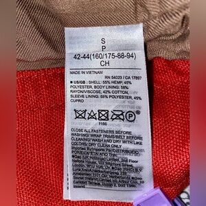 * Fabric: shell: 55% hemp, 45% polyester / Body lining : 48% cotton, 58% rayon / sleeves lining : 55% polyester, 45% cupro. Sustainable; made with recycled fabrics