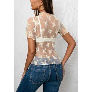 🆕Women's Beige Mesh Sheer Long Sleeve Mock Neck Lace Floral Top Polyamide Sexy