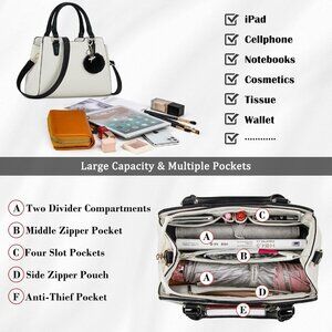 Spacious Capacity & Multiple Pockets: Our handbags are roomy enough which can satisfy all your daily essentials. The handbag includes three compartments, one middle pocket, one compartment with zipper pouch and the other with four slots. And there is an outer zipper pocket on the back of the purse. The huge capacity of the handbags women accommodates your wallet, ipad, books, cosmetics, etc. The dimension of the bag is 12*8.5*5.5 inch that is excellent for women to carry with gorgeousness