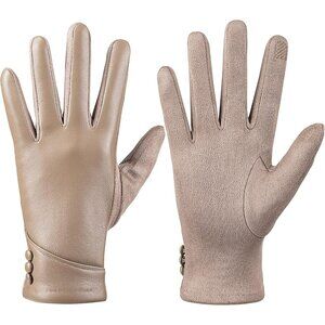 Women's Beige Winter Leather Touch Screen Wool Lined Windproof Warm Dress Gloves