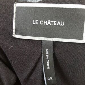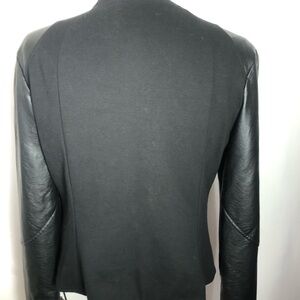 Women’s Black Faux Leather Jacket. Large. Le Chateau. Like New. Faux leather sleeves and front. Fabric back. No peeling 21” pit to pit 22” overall length 24” sleeve length By: LeChateau Was $65 Now $32