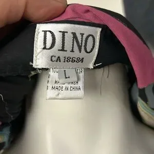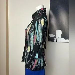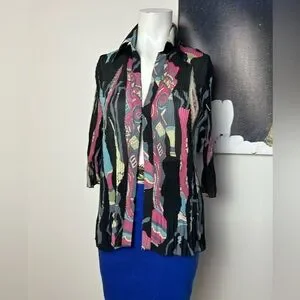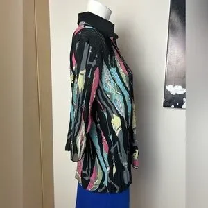 Stylish black top with a vibrant multi-color abstract pattern. Lightweight, flowy fabric for comfortable all-day wear. Classic collar and button-front styling for a polished look. Versatile piece that pairs well with skirts or pants. Features blue, pink, cream, and green tones in the design.