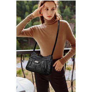 Women's Black Soft Pu Leather Multi-pocket Shoulder Bag Medium Cross-body Purse