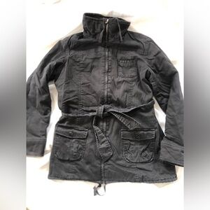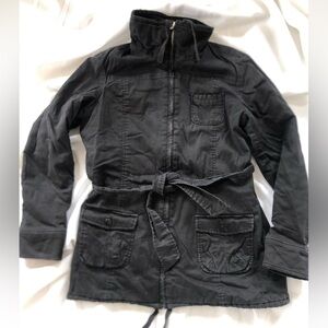 Old navy, size small. Black but a bit faded from the washing over the years. Original owner. Originally from spring 2009. I absolutely love this jacket, super versatile. Very flattering with the belt. Comfy to wear. This coat has been to England and back!