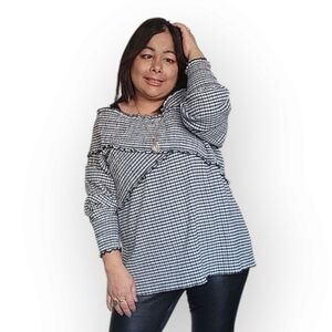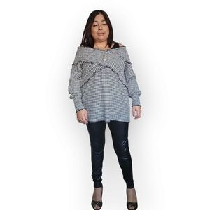 Stylish off-shoulder top in classic black and white. Perfect for casual outings or a night out. Comfortable and chic design.