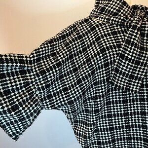Women's Black and White Poncho with ruffle sleeves and attached scarf - Great preowned condition! No tags so not sure of fabric content. Likely a one size fits most.