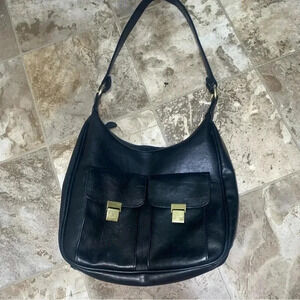 Women’s Faux leather Black shoulder bag purse. Gold details. No brand tag. Lots of pockets and storage. Back side is a full wallet with mirror included. A few marks on the inside of the bag but in otherwise great condition. Measurements are included in photos. Hobo style. Vintage inspired. Classic style.